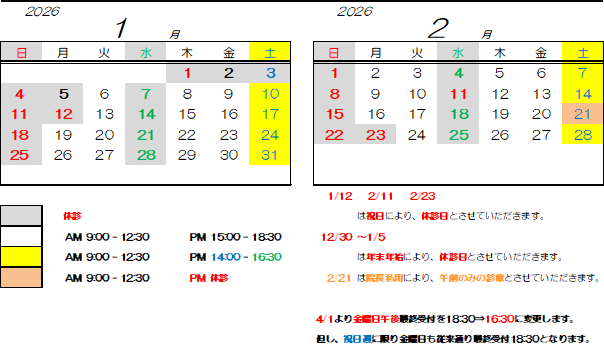 2026年4月1日より下記の通り診療時間を変更いたします。